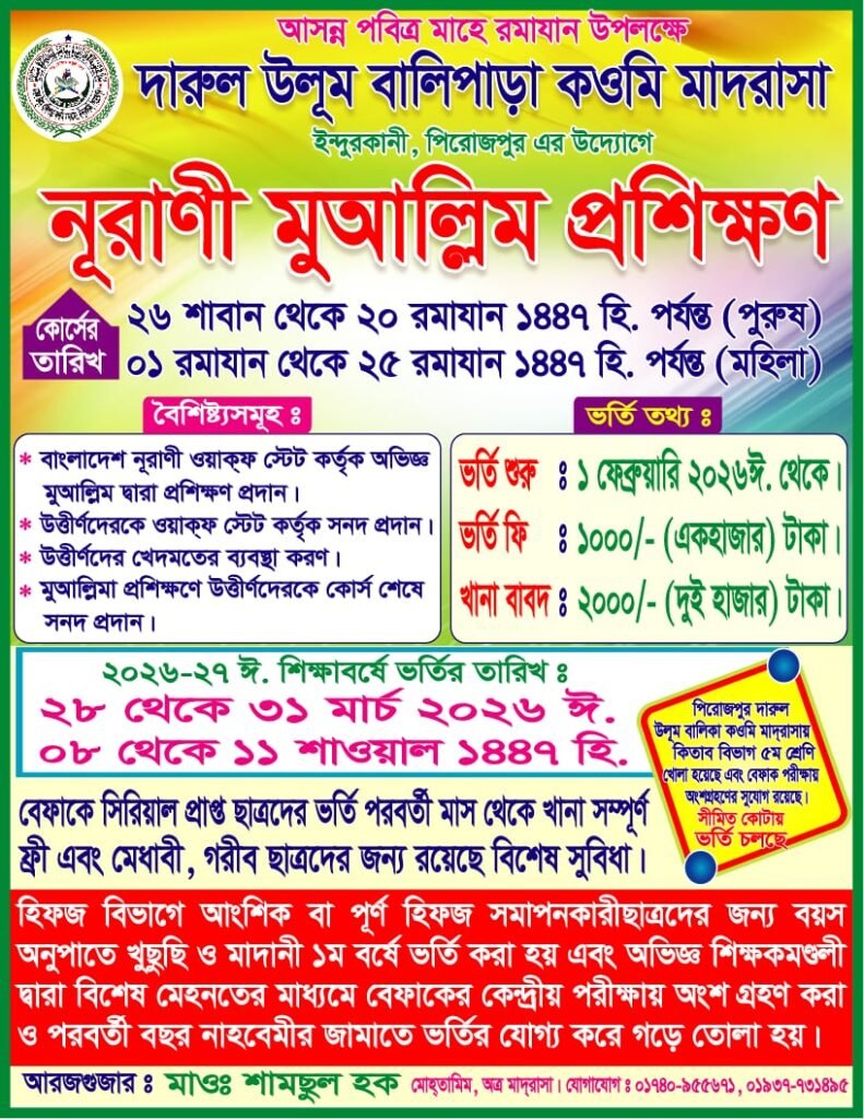 নিজস্ব প্রতিবেদক | ইন্দুরকানী, পিরোজপুর ঐতিহ্যবাহী দ্বীনি শিক্ষা প্রতিষ্ঠান দারুল উলূম বালিপাড়া কওমি মাদ্রাসা ও এর শাখা প্রতিষ্ঠানসমূহের ২০২৬-২৭ ইংরেজি (১৪৪৭-৪৮ হিজরি) শিক্ষাবর্ষের বার্ষিক ক্যালেন্ডার ও খানার টাকা পরিশোধের নির্ধারিত তারিখ ঘোষণা করা হয়েছে। মাদ্রাসার মুহতামিম মাওলানা শামসুল হক স্বাক্ষরিত এক বিজ্ঞপ্তিতে এই তথ্য জানানো হয়। ❤️🩷যাদের (কোরআন ও হাদীসের) ইলম আছে আর যাদের নাই […]