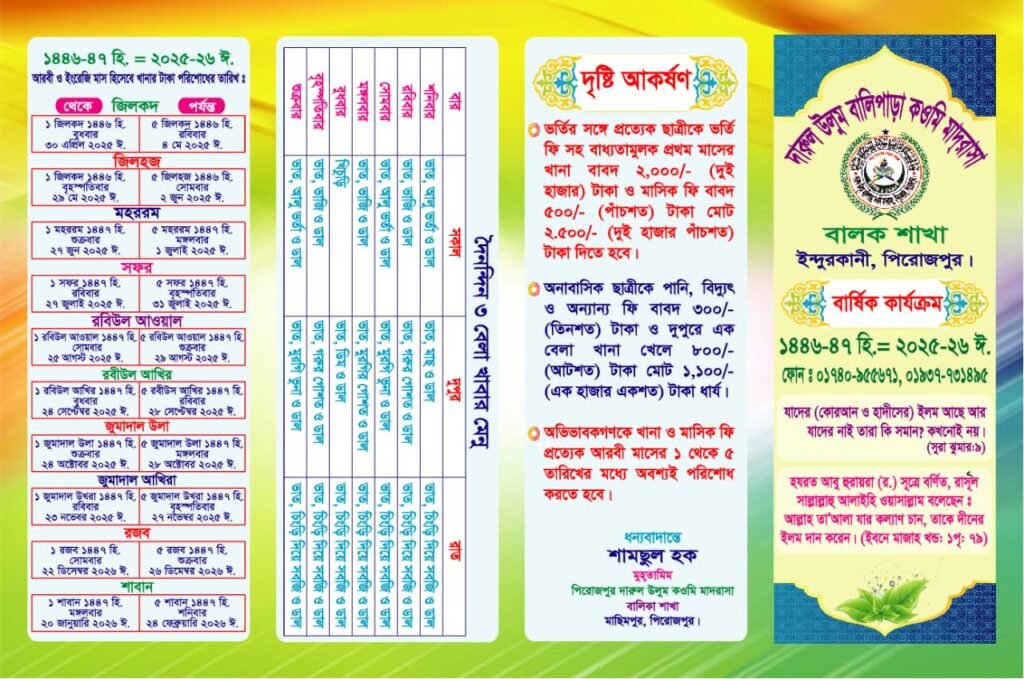 দারুল উলূম বালিপাড়া কওমি মাদরাসা, ইন্দুরকানি, পিরোজপুর। বালক শাখার ২০২৫-২৬ ঈ. শিক্ষাবর্ষের বার্ষিক কার্যক্রম।