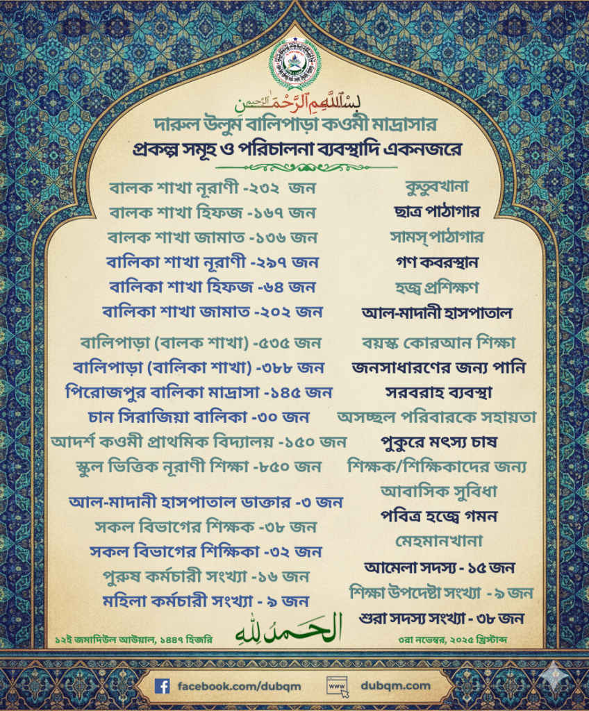 আসসালামু আলাইকুম ওয়া রাহমাতুল্লাহি ওয়া বারাকাতুহ দারুল উলুম বালিপাড়া কওমী মাদ্রাসার প্রকল্প সমূহ ও পরিচালনা ব্যবস্থাদি একনজরে বিস্তারিত জানতে হলে ক্লিক করুন: https://www.facebook.com/share/p/1BXS7CS2yv #প্রকল্প #madrasah #qawmimadrasa #Qawmi #balipara #DarulUloom #darululoomdeoband #Darul #Hafiz #donatenow #QuranHafiz #quranlearning #quranmajeed #দারুল #উলূম #বালিপাড়া #কওমী #ramadan2026 #যাকাত #যাকাতক্যালকুলেটর #ZakatDonation #prokolpo - ১২তম মজলিশে শুরা—সফলভাবে সম্পন্ন